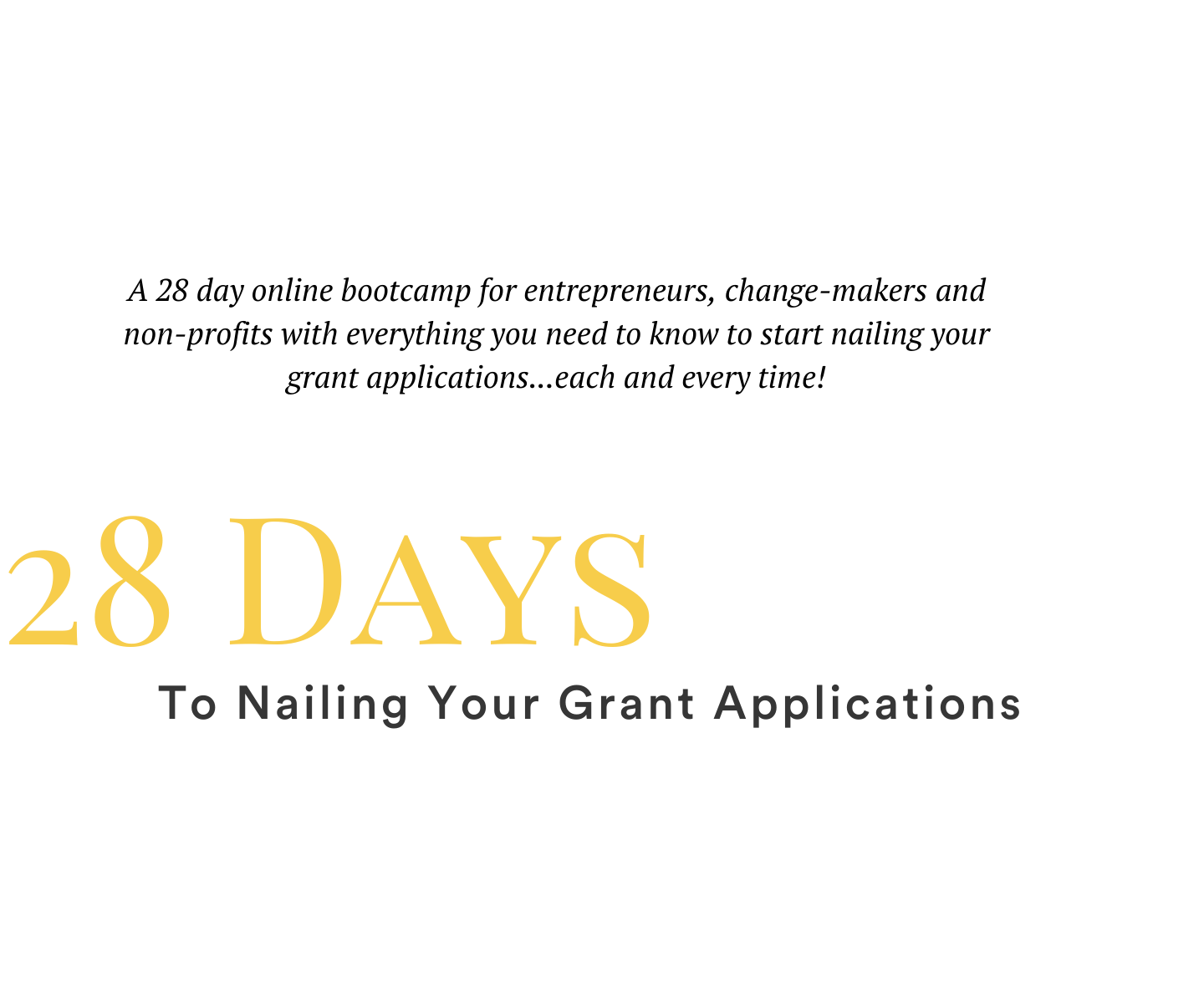 A 28 day online bootcamp for entrepreneurs, change-makers and non-profits… with everything you need to know to start nailing your grant applications each and every time.